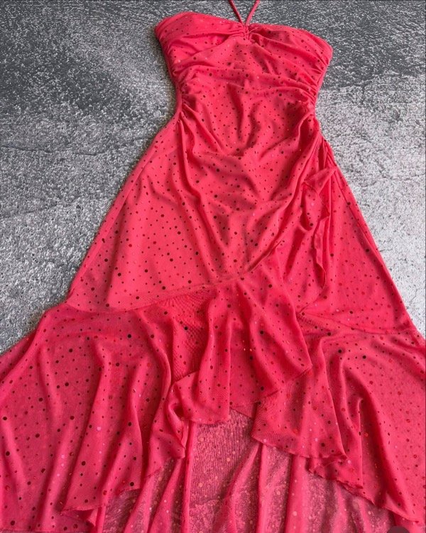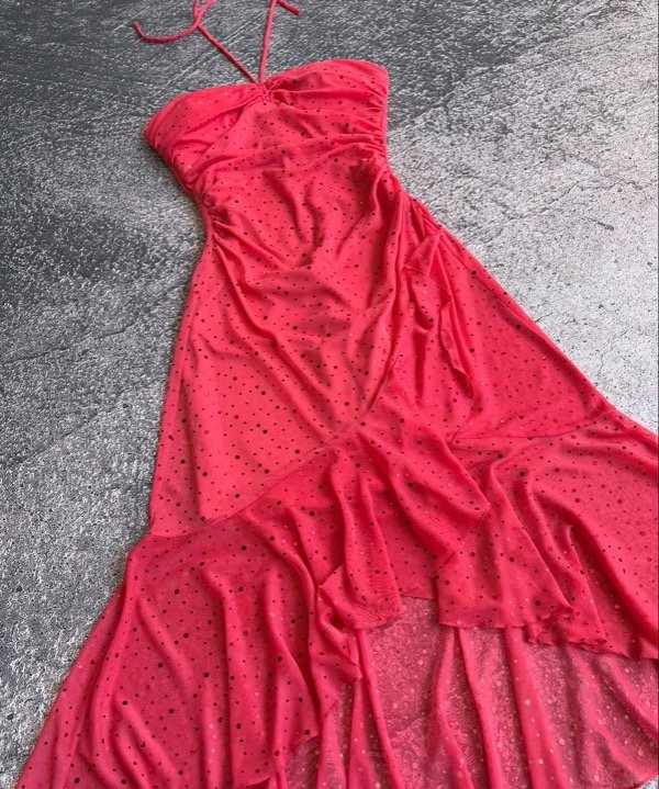 Hermosa tela y diseño con mini circulitos brillosos, de ata en el cuello, perfecto estado.